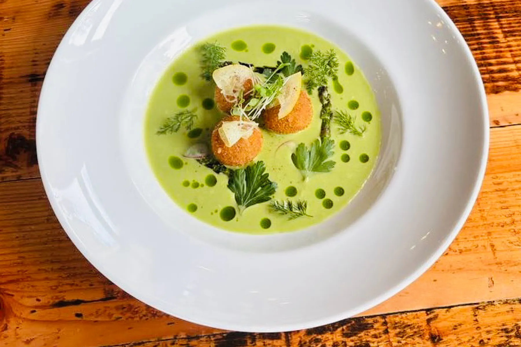 Pomme Purée, Dashi Garlic Cream, Potato Kombu Crumble, Pickled Grilled Garlic Scapes